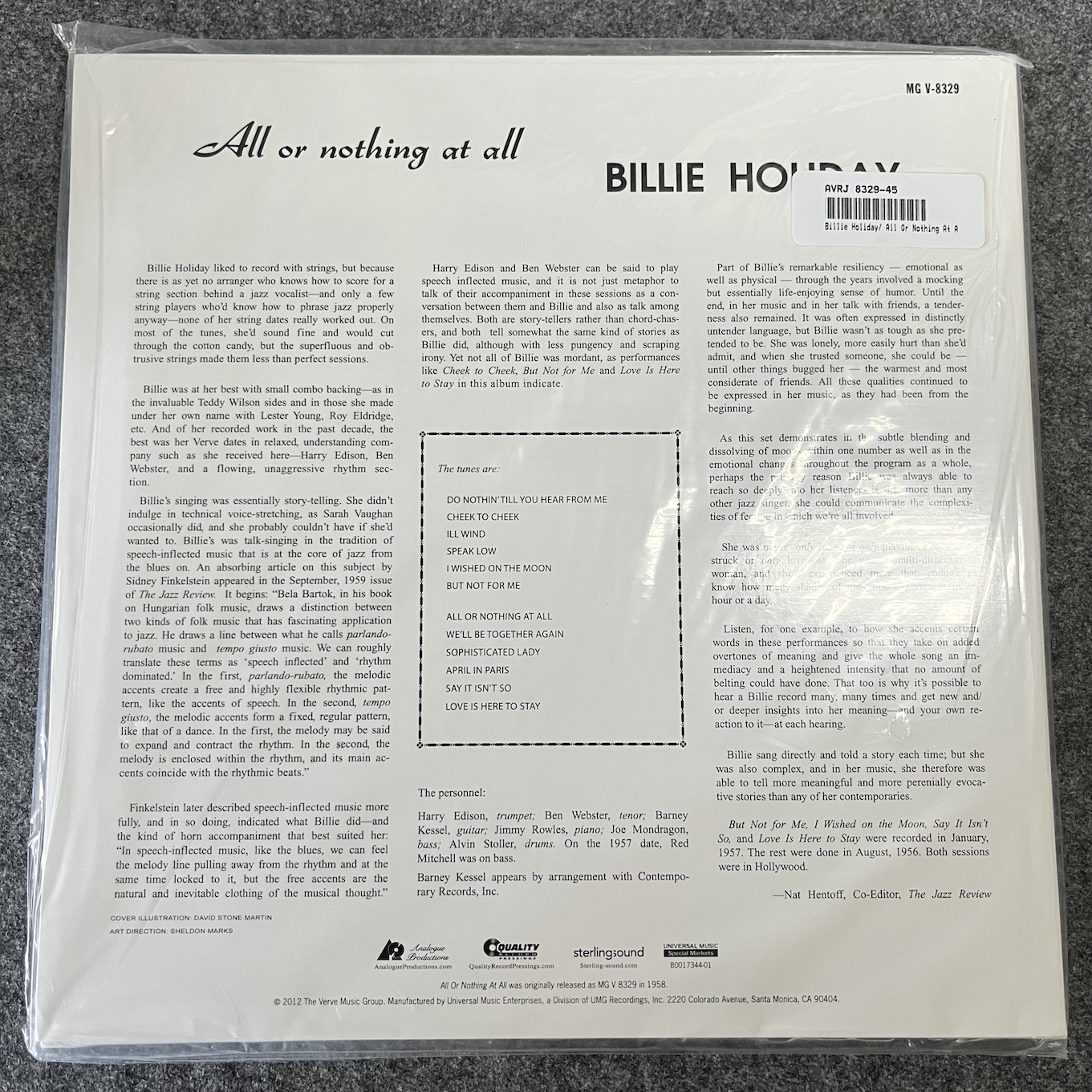Original LP release catalog number MG V-8329. Comes with insert showing other Verve Reissue releases from Analogue Productions, writing about the remastering process at Sterling Sound and photos of the original master tape boxes.